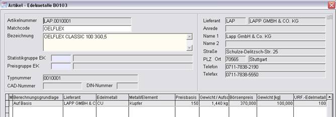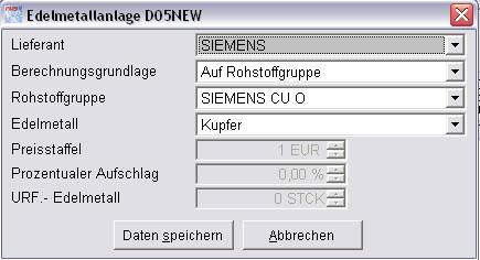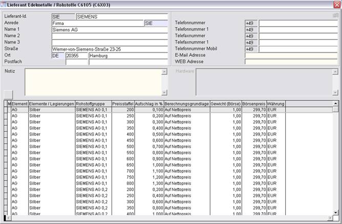 Neben der Angabe von Edelmetallgewichten im Artikelstamm besteht auch die Möglichkeit der Zuordnung von sogenannten Rohstoffgruppen der Lieferanten. Diese definieren eine Staffelung prozentualer Zuschläge auf den Einkaufspreis abhängig vom aktuellen Börsenpreis.