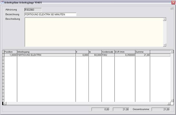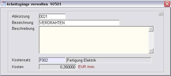 Unter dem Menüpunkt „Stammdaten/Arbeitsgänge“ werden Arbeitsgänge definiert.