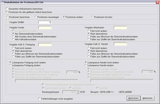 Es kann der gesamte Artikelstamm, gefilterte Artikeldatensätze oder nur der aktuelle Artikel neu berechnet werden.