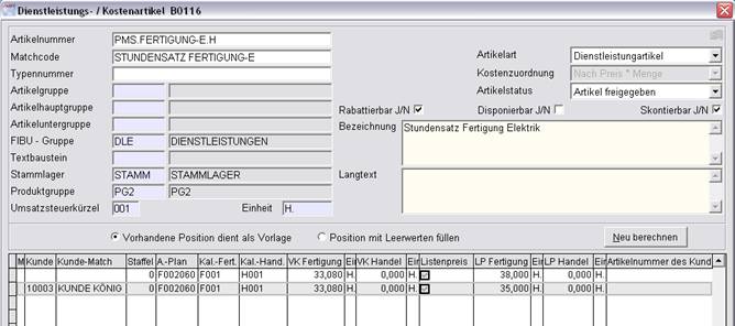 Dienstleistungsartikel werden zur Kalkulation von materialunabhängigen Lohnanteilen verwendet und als Stundensätze, Tagessätze oder Pauschalen abgebildet. Außerdem sind auch hier die kundenbezogenen Kalkulationen nutzbar.