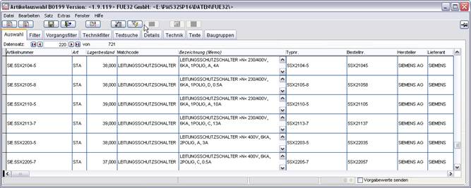 Die Seite Auswahl zeigt die in PMS erfassten Artikel in Tabellendarstellung an. Mit Hilfe einer Eingabe kann in vielen Feldern direkt nach bestimmten Datensätzen gesucht werden. Mit der Enter-Taste kann ein gewünschter Artikel an EPLAN® übergeben werden. Diese Funktion ist wie auch die sonstigen wichtigsten Funktionen direkt über die Symbolleiste möglich.