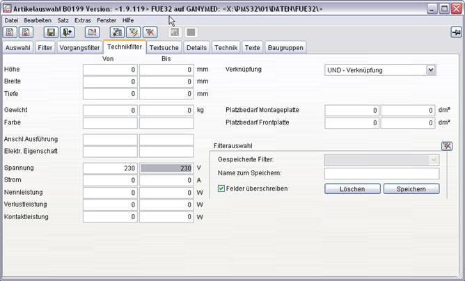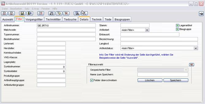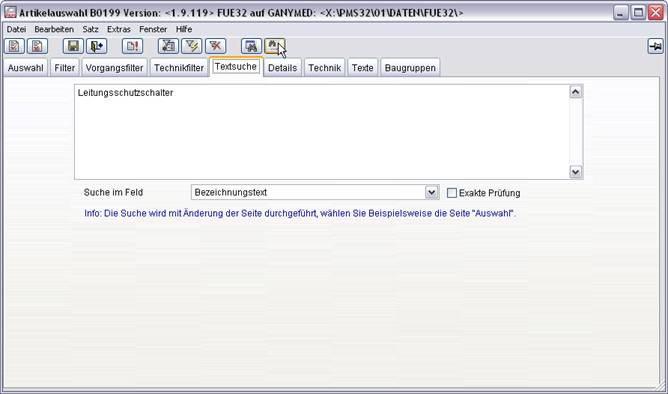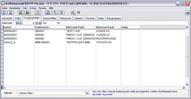 Bei Nutzung dieses Filters wird bei jedem Klick auf die Register Auswahl, Details, Technik, Texte,