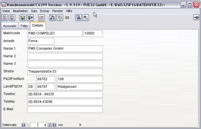 Das Fenster Kundenauswahl zeigt die in PMS vorhandenen Kunden an. Es stellt die drei Seiten Auswahl, Details und Filter setzen zur Verfügung. Die grundlegenden Bedienelemente sind identisch mit denen in der Artikelauswahl.