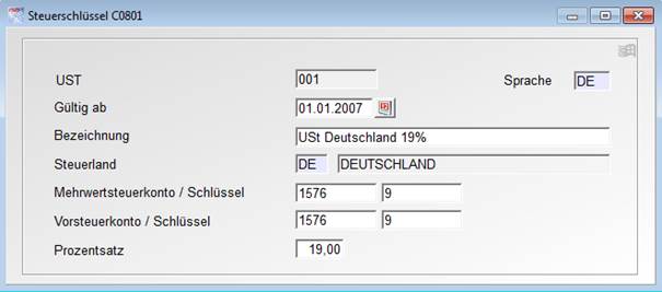 Der Schlüssel „UST“ selbst wird im Artikelstamm in der Maske „Artikel-Allgemein“ hinterlegt und bestimmt den Steuersatz, mit dem der Artikel belegt werden soll.