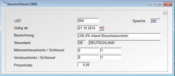 Um nun das Reverse-Charge- Verfahren anwenden zu können ist zuerst ein neuer Steuerschlüssel zu definieren. Im untenstehenden Beispiel ist dies das Kürzel „004“.