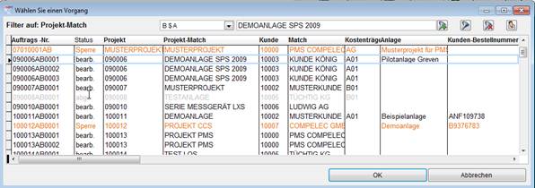 Wie in Kundensicht, jedoch mit der Struktur von sechs Bereichen: Vorgangsart, Kunde, Jahr, Projekt, Vorgangsstatus, Vorgangsnummer