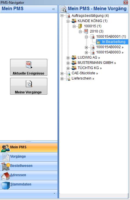 In diesem Bereich werden alle Vorgänge angezeigt, in denen ihre PMS-Benutzerkennung in den Feldern Sachbearbeiter 1, 2 und Projektleiter vorkommt oder keine der genannten Felder gefüllt sind. Beim Doppelklick auf den Letzten Eintrag (Vorgangsstatus) wird der entsprechende Vorgang gestartet.