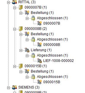 Wie in Bestellungssicht, jedoch mit der Struktur von fünf Bereichen: Lieferant/Kunde, Bestellung, Vorgangsart, Vorgangsstatus, Vorgangsnummer