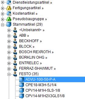 Hier werden die Baugruppen einstufig angezeigt, eine Baugruppenauflösung ist derzeit nicht implementiert. Struktur von fünf Bereichen: Baugruppe, enthaltene Artikelarten, Artikelnummer, Lieferant, Artikelnummer